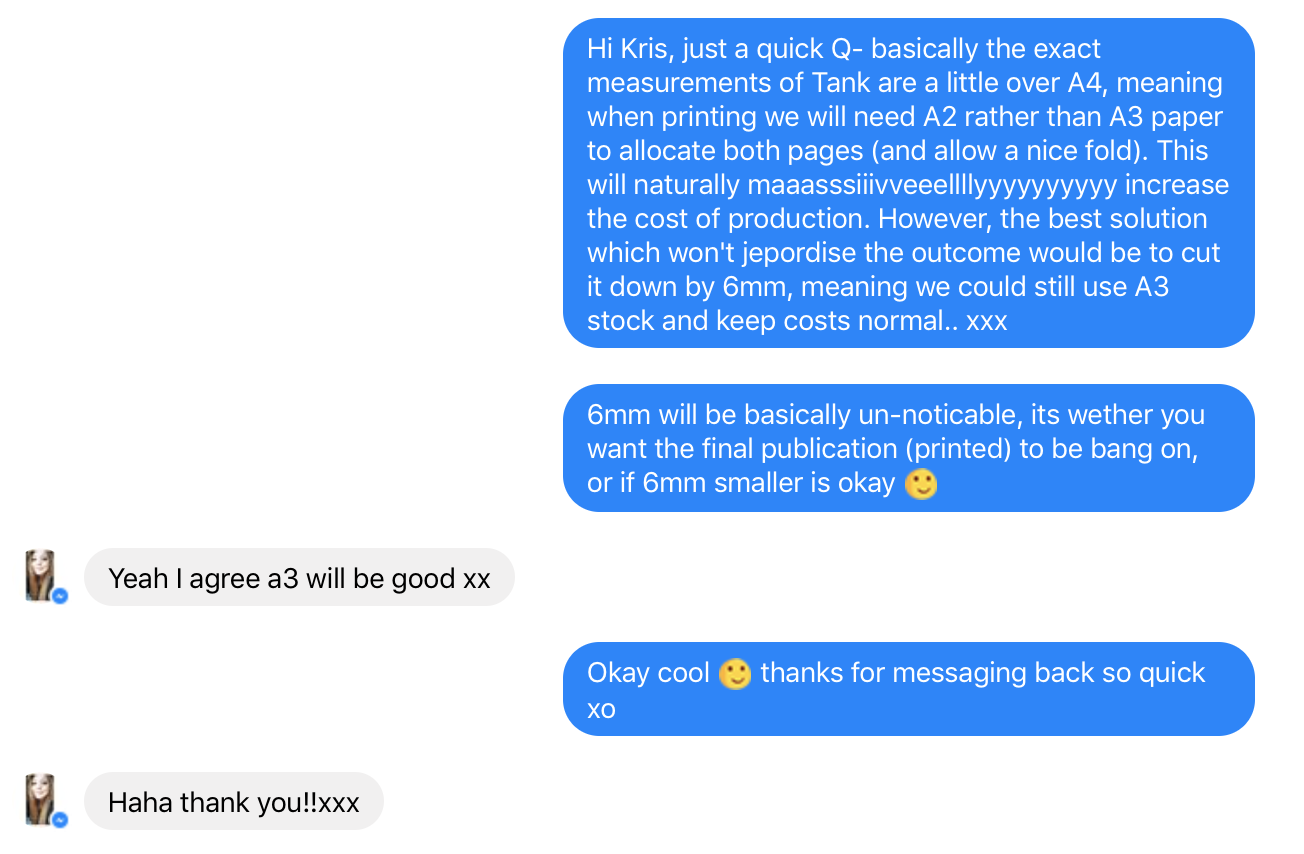 When observing Tank magazine it was evident the main aspect of descriptive content was mainly interviews and reviews of issues by creative writers, as well as artist statements. To follow suit with the holistic design approach to position Kristina's Tank as the real thing, I decided to practice my interviewing skills in preparation for visiting Kate Allsop in London, and interview Kristina for a feature within Tank Magazine. This experience was extremely beneficial and made me realise the importance of pre-prepared questions when interviewing, something I will keep in mind for future interviews.